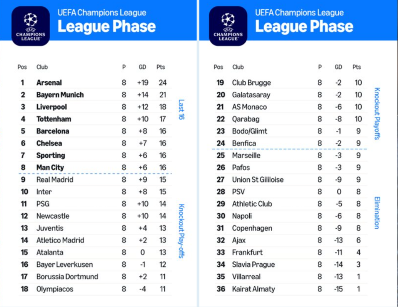 Her er den endelige stilling i Champions Leagues ligaspil.
